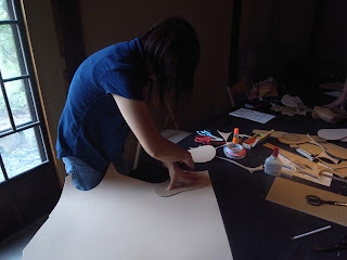 ダンボールで作った足形にそって底につけるコルクをカットします。